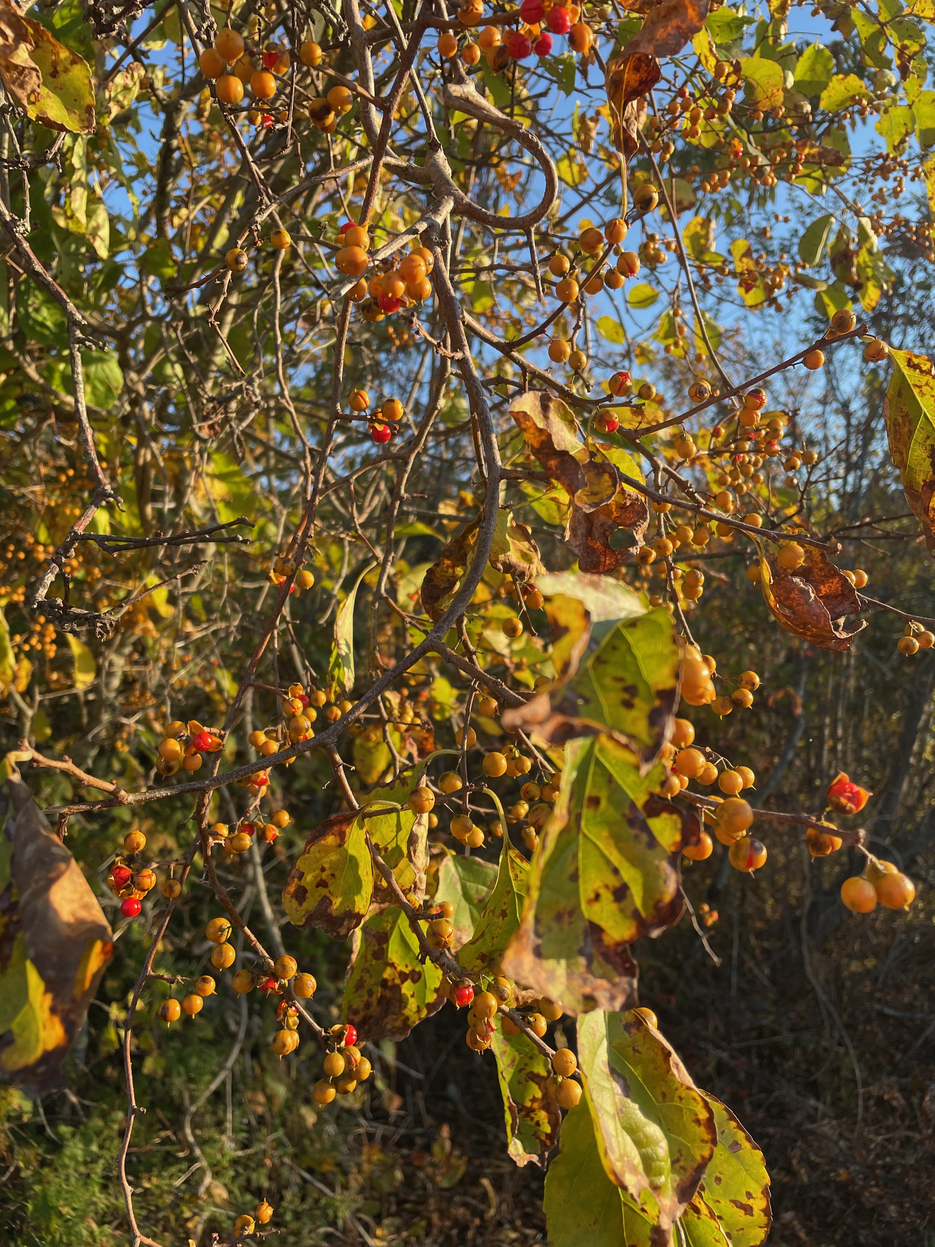 This seems to be asiatic bittersweet (Celastrus orbiculatus), which the DACF calls “severely invasive.” The DACF website describes the fruit as “Distinctive yellow aril covers orange-red seed. Fruits mature in fall and persist into winter.” Part of the Night Shade family, it is poisonous to humans, but birds can apparently it with impunity.