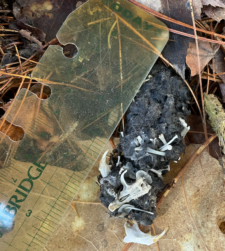 Today we checked out our vernal pool over at Shore Acres. No eggs yet… But Fay found bobcat scat containing the skeleton of a shrew (see the orange on the incisor?).