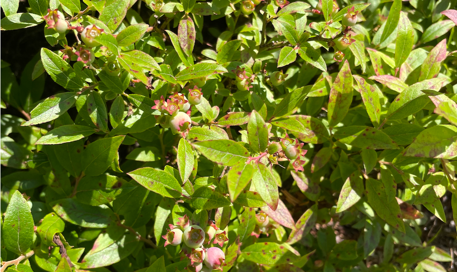 When I was walking Eddy in the quarry this morning, I saw blueberries fruiting. I wish I could have taken a picture of these tiny, delicate pink fruit, but I didn’t have my phone with me. Fortunately, we went back the next day and i got a picture of a similar bush.