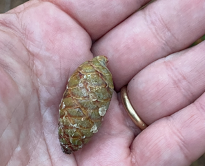 I had noted in my original email to Susan that one of my Google-based sources reported that fir cones don’t fall to the ground intact. Since these cones were all intact, and since they were too small to be spruce cones and were obviously not pine cones, I guessed these were hemlock cones (cone size being another important way of identifying amongst the pine family). Susan warned me away from any statement that included the word “always” — but added that she had not heard that before. So I sent her the link to the Purdue University Landscape Report’s “Conifer cone production” page.